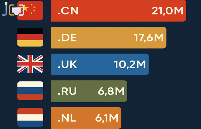 1 место: Китай .CN — 21 млн доменных имен и их, видимо, не догнать.